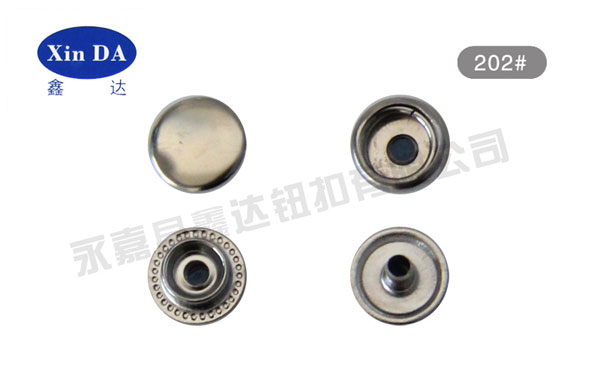 四合扣是紐扣的一種,俗稱彈簧扣、車(chē)縫鈕。四合扣靠S型彈簧結(jié)合,從上到下分為ABCD四個(gè)部件:AB件稱為母扣,寬邊上可刻花紋。中間有個(gè)孔,邊上有兩根平行的彈簧;CD件稱為公扣。中間突出一個(gè)圓點(diǎn),圓點(diǎn)按入母扣的孔中后被彈簧夾緊,產(chǎn)生開(kāi)合力,固定衣物。